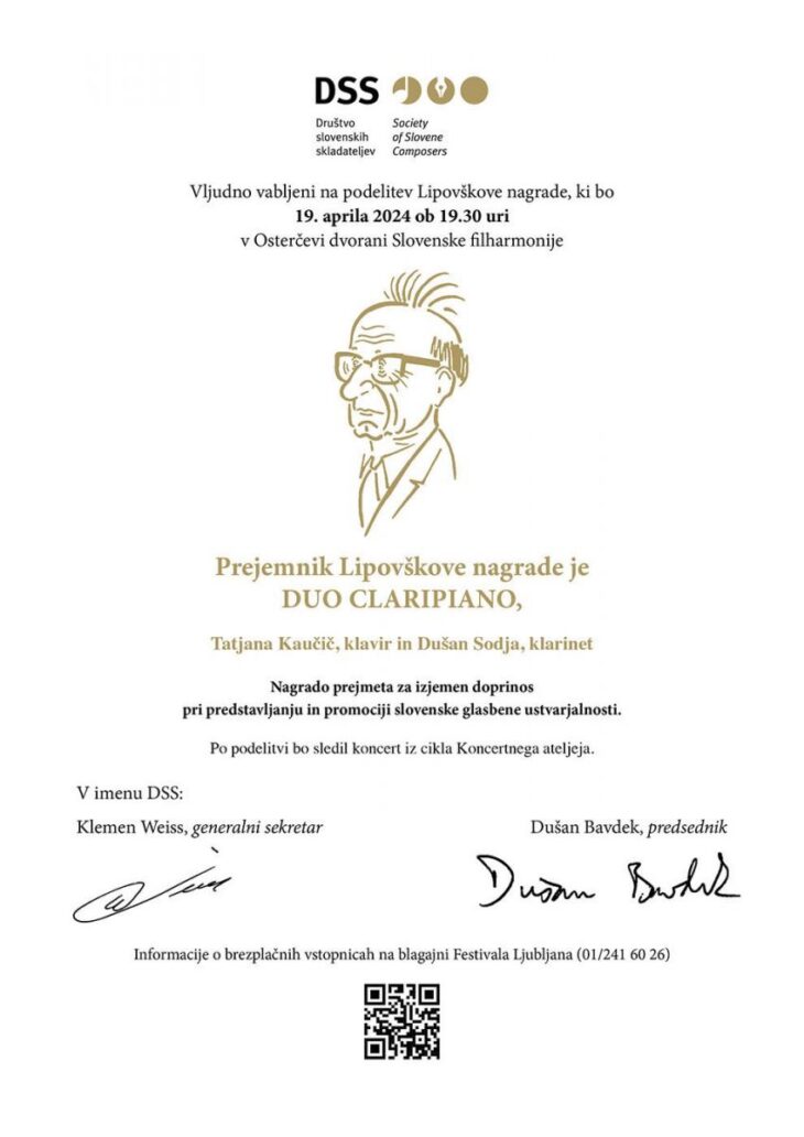 Za vse to, ne samo za dosežke v vsem 30-letnem delovanju Dua Claripiano sta v odmoru tega koncerta predsednik DSS Dušan Bavdek in predsednik njihove Komisije za nagrade, priznanja in odlikovanja Tomaž Habe izvajalcema podelila Lipovškovo nagrado DSS; poimenovana je po slovenskem skladatelju, pianistu in pedagogu Marijanu Lipovšku (1910-1995). Kako vredno je bilo tole odlikovanje za naš Duo, priča že dejstvo, da je bilo to šele drugo od vsega njenega obstoja (prvo je leta 2013 prejel »DSS-jev hišni ansambel MD7 – Musica Danubiana, septet, ki ga je takrat vodil skladatelj Pavel Mihelčič). Celoten scenarij, vse od dramaturgije koncerta pa do tele podelitve je bil tako enovit in enoten, tak, ki je uspel privabiti v malo alias Osterčevo dvorano SF polnoštevilno občinstvo. Tako in toliko, ki je je slovenska glasba redko pozorna. Četudi za en dan, en večer, je bilo to le srečanje z njeno odličnostjo v vseh pogledih; s slovensko glasbo v ustvarjalnem in poustvarjalnem pogledu.